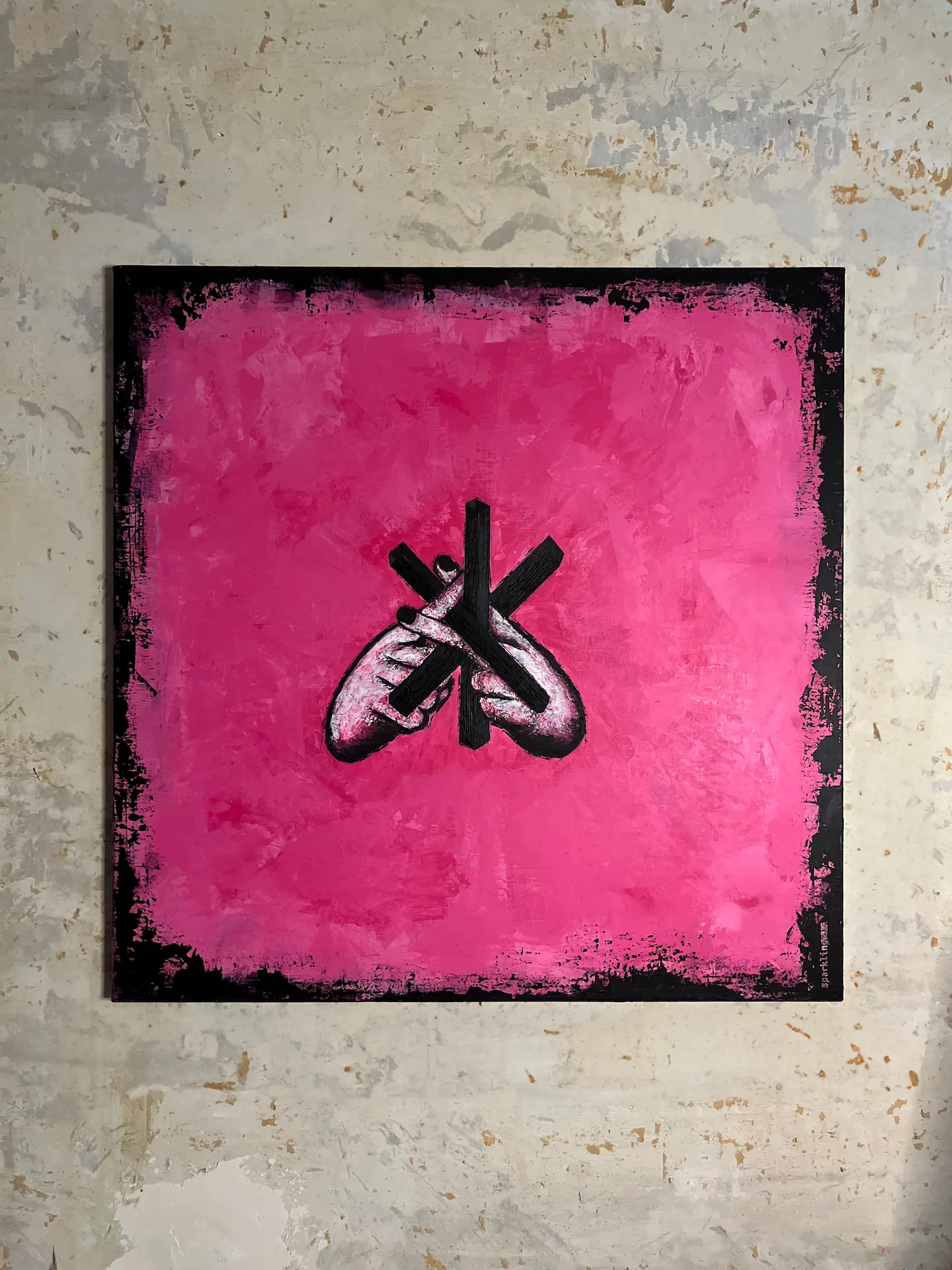 На рожевому фоні картини у чорному обрамленні по центру зображення металевої конструкції – протитанкового «їжака», яка використовується для облаштування оборони та захисту в умовах військового нападу. Зображення металевої конструкції мистецьки вкладено у зображення двох рук у конфігурації жесту «протитанковий їжак».